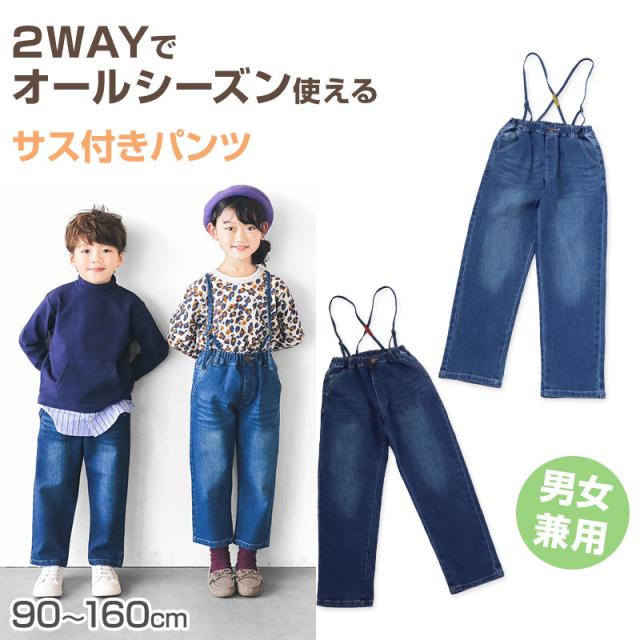 サスペンダーがかわいいユニセックスのデニムパンツ。