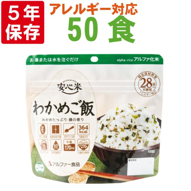 非常食 アルファ米 安心米「わかめご飯 50食セット/箱」5年保存 国産米100% アルファー食品(防災食 ワカメ ごはん アルファー米 賞味期限5年 アルファ化米 非常食セット お米 非常用 災害用 保存食セット