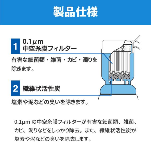 0.1μmの中空糸膜フィルターが有害な細菌類、雑菌、カビ、濁りなどをしっかり除去。また、繊維状活性炭が塩素や泥などの臭いを除去します。