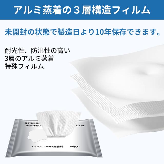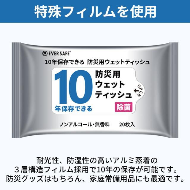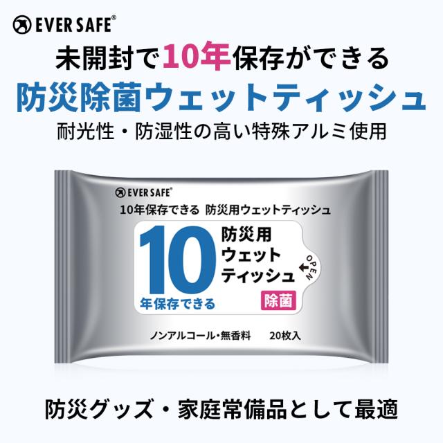 衛生用品 10年保存できる防災用ウェットティッシュ 単品 メール便10個までOK 長期保存 ノンアルコール 無香料 防災グッズ 災害 水害 ES10YWT EVERSAFE