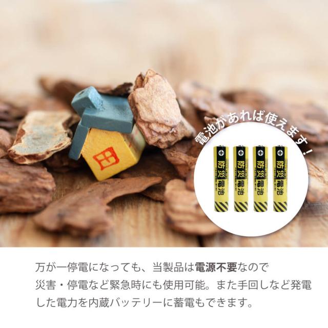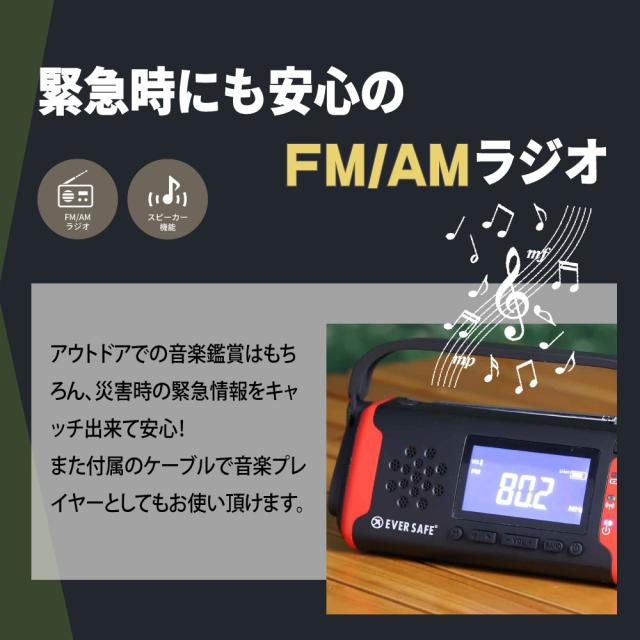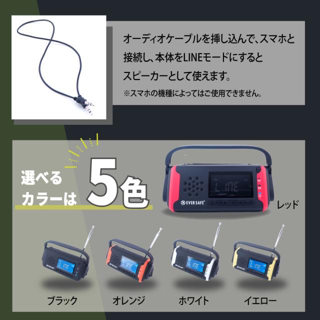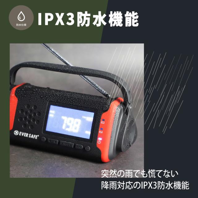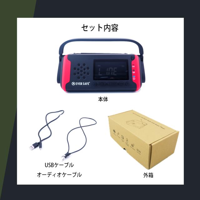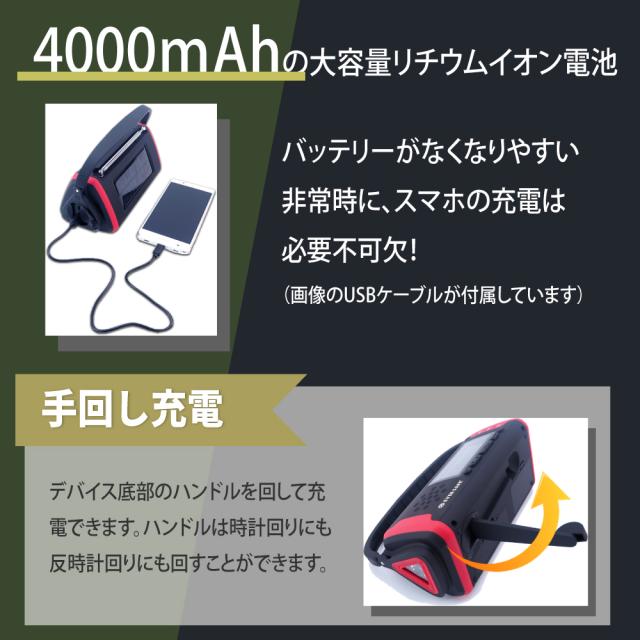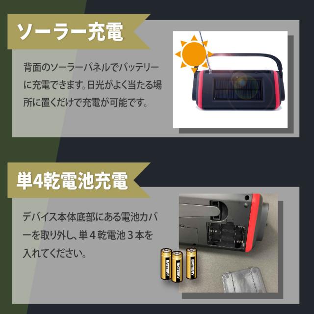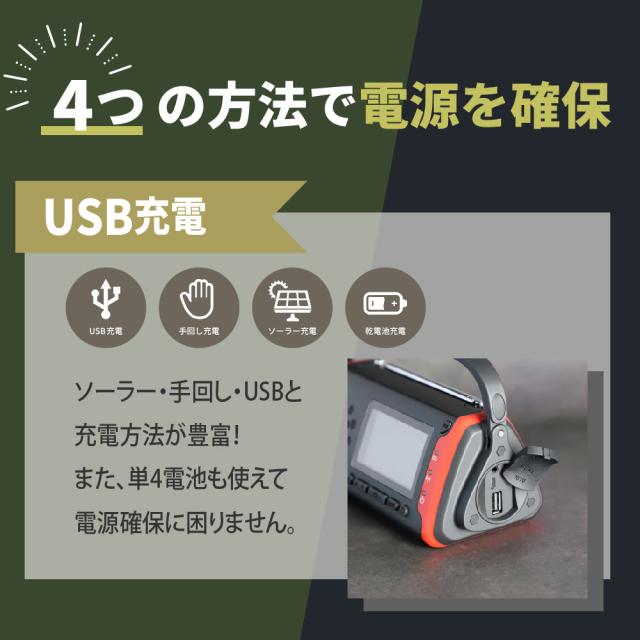 ・充電:ソーラー、手回し、USB、単4乾電池3本