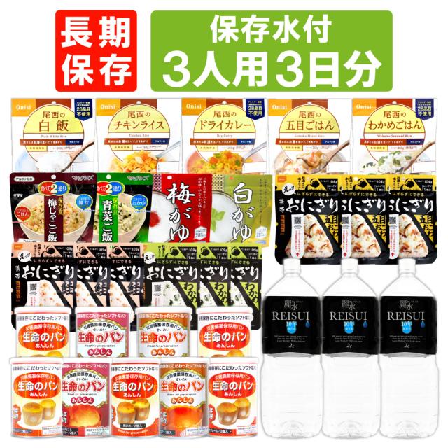 3人用/3日分(27食) 非常食セット【10年保存水付】アルファ米/パンの缶詰 家族3人分 3日間生きのびる (防災食 防災 食品 尾西 携帯おにぎり サタケ 安心米 保存食セット 防災セット 防災グッズ 災害備蓄用パン
