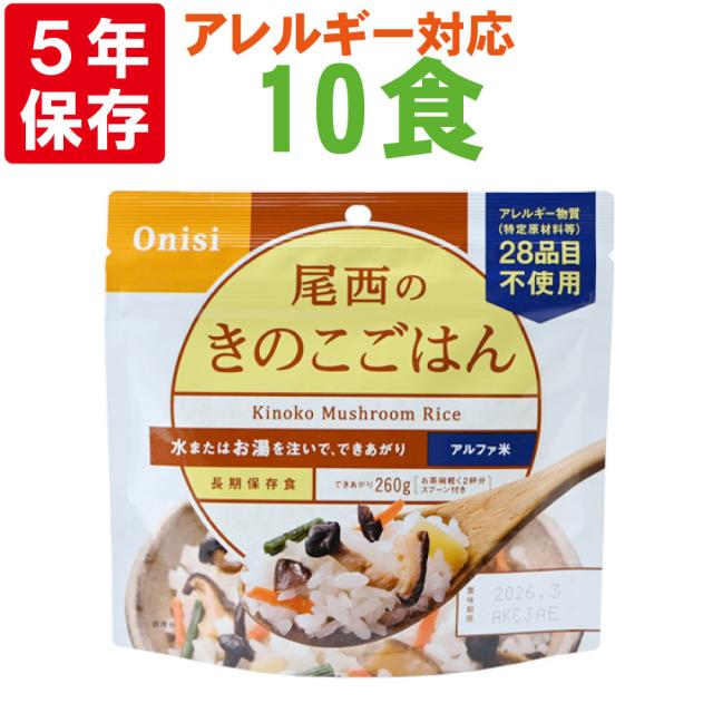 尾西食品 アルファ米「きのこごはん 10食セット」5年保存食 非常食 アレルギー物質(特定原材料等)28品目不使用 きのこご飯 アルファー米 尾西 アルファ化米 お米 ごはん ライス 非常用 災害用 保存食セット 防災セット