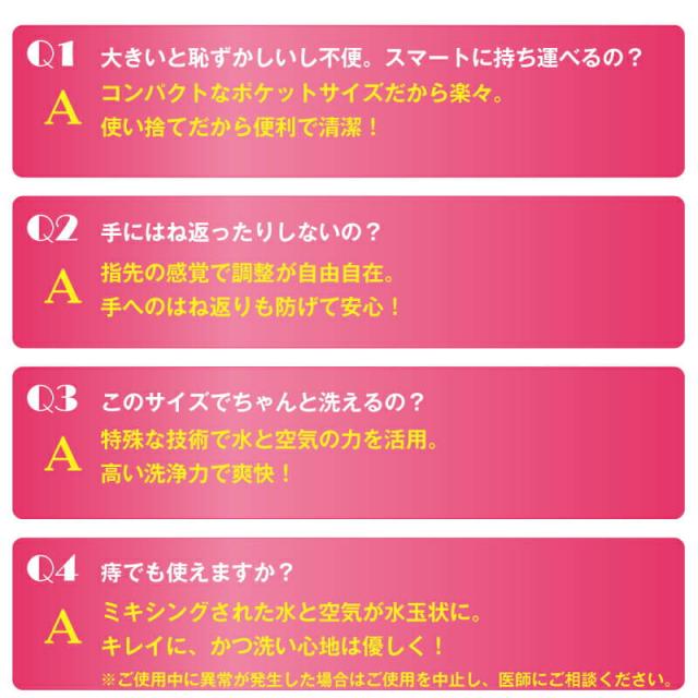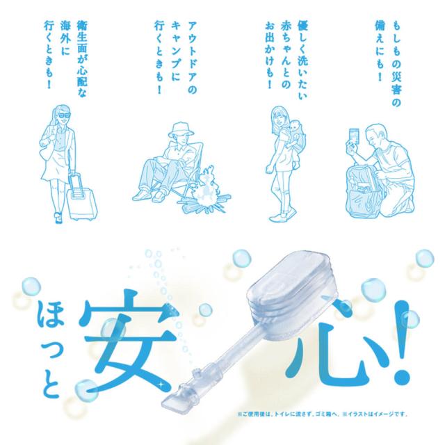 特殊なノズル技術で、水と空気をミキシングして水玉状に噴射する、使い切りお尻洗浄器です。