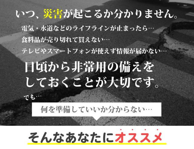 - レビューを見ると届くのがすごく遅いとあったのですが1週間で届きました。 そろそろ準備しとかないとと思って調べていたら非常食も入っていたので主人の分と2組購入しました。