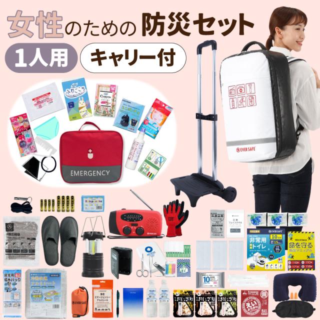 女性のための防災セット 1人用 EVERSAFE 底まで開く防災リュック エマージェンシーポーチ キャリーカート 2way 女性用 防災士監修 警戒レベル4 L4TPLACR01