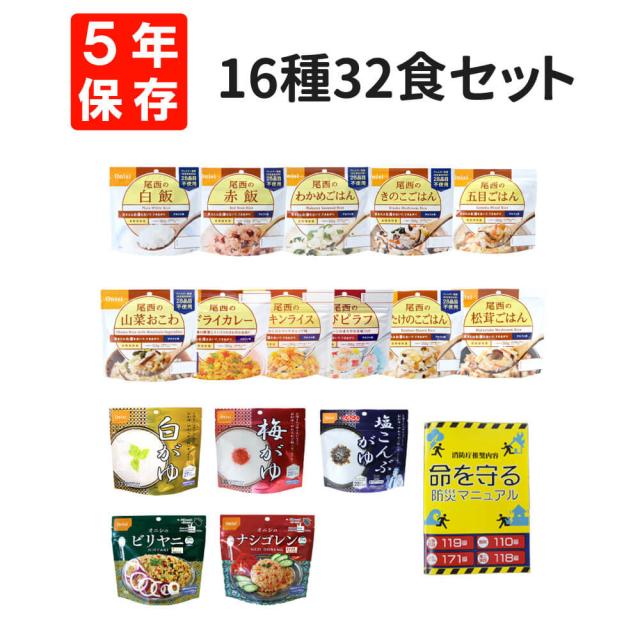 非常食セット 尾西食品 アルファ米 32食セット 全16種類x各2袋コンプリートセット 5年保存食 防災マニュアル付 アレルギー対応食入 尾西のアルファー米 onisi 賞味期限5年保存 防災用品 備蓄品