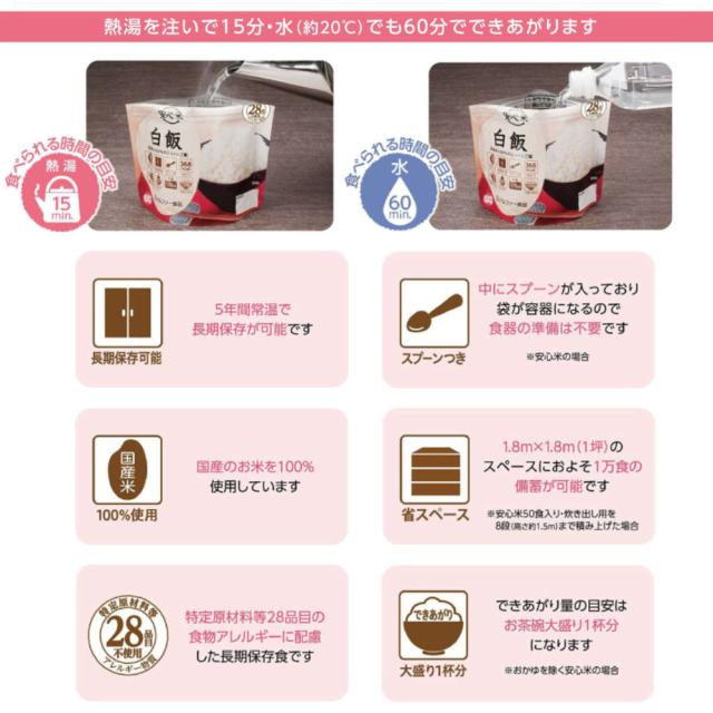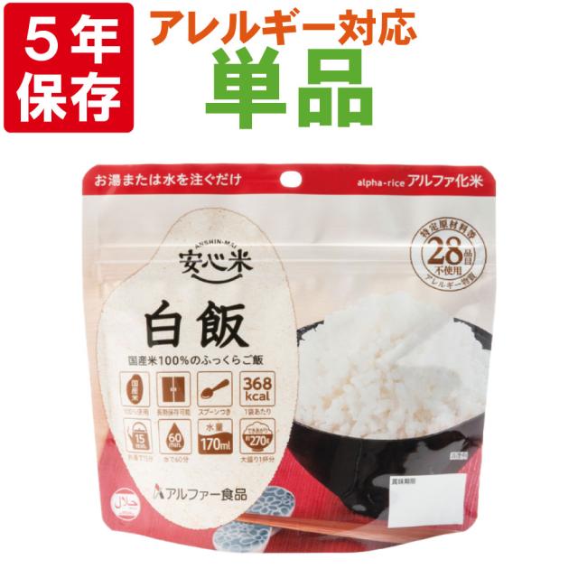 【メール便4個までOK】非常食 アルファ米 安心米「白飯」5年保存 国産米100% アルファー食品 防災食 白米 ご飯 アルファー米 賞味期限5年 アレルギー物質(特定原材料等)28品目不使用 アルファ化米 お米 非常用
