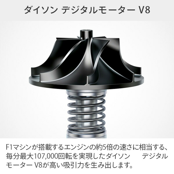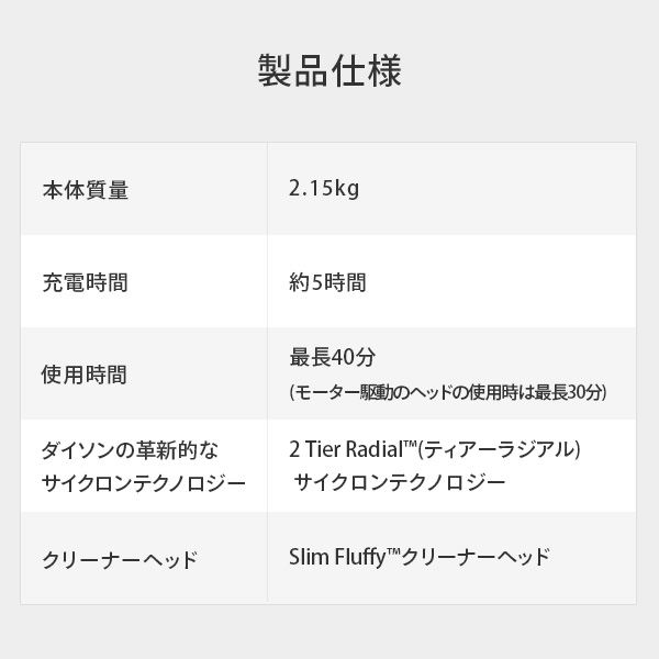 | 商品説明 | ●安定したパワー供給により最長40分間のパワフルで変わらない吸引力を実現 ※モーター駆動ではない付属ツールを、通常モードで使用した場合の最長運転時間 ●ダイソンデジタルモーターV8:毎分最大107000回転しパワフルな吸引力を実現 ●航空機に使用される軽量アルミニウム製のブラシバーを覆うナイロンフェルトが大きなゴミを捕らえ、同時にカーボンファイバーブラシが微細なホコリを取り除きます ●高い密閉性と精密な製品設計により、0.3ミクロンもの微細な粒子を99.99%捕らえます ※ASTM F1977-04に基づく試験結果。試験は強モードで実施 ●1台3役:ツールを付け替えて、スティッククリーナー、布団クリーナー、車掃除に便利なハンディクリーナーとして使用可能 ●クリアビンやフィルター、ブラシバーは簡単に取り外せ、お手入れが可能 ●吸い取ったホコリやゴミに触れずに、ワンタッチで簡単にゴミ捨て ●壁掛け式の収納用ブラケットに掛けておけば、次の掃除のときにすぐ使える ●メーカ2年保証付き ●モーター:ダイソンデジタルモーターV8 ●標準ヘッド:Slim Fluffyクリーナーヘッド ●ゴミ容量:0.54L ●充電時間:約5時間 ●電源コード長さ:1.8m ●付属品:収納用ブラケット、ミニモーターヘッド、コンビネーションノズル、隙間ノズル |