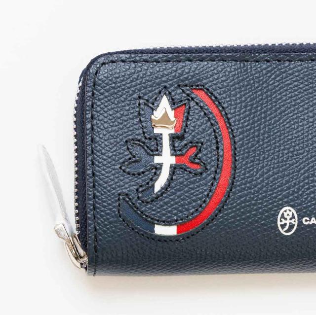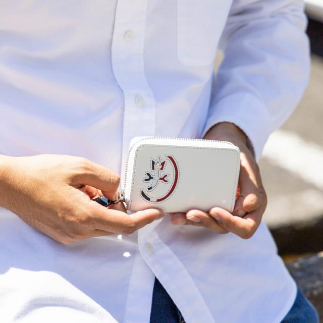 ブランドアイコンである家紋をトリコロールカラーで表現し、王冠部分にはメタルパーツで立体感を出しています。また、エンボス加工を施したオリジナル牛革に、シルバー箔押しのブランドロゴを入れることで高級感を演出しています。