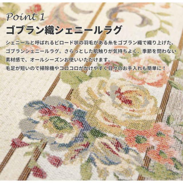 エレガントで上品な花柄のゴブランシェニールラグ。カラーは、ベージュ(4955872812724/240612884)、グレー(4955872812731/240612889)です。さらっとした肌触りで季節を問わずオールシーズンお使いいただけます。中材に約5mmのウレタンを使用し、程よいクッション性。撥水機能付きで、こぼれた水もサッと拭き取れシミになりにくい!汚れても手洗いできます。また、毛足が短いので掃除機やコロコロがかけやすく掃除もラクラク♪ホットカーペット・床暖房対応で、寒い時期は併せて使うことで暖かく過ごせます。裏面は床を傷つけにくい不織布です。