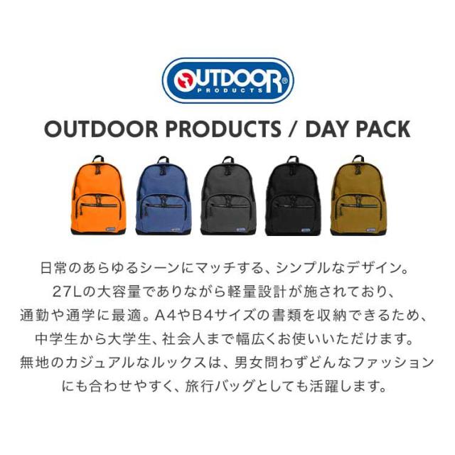 リュック アウトドアプロダクツ OUTDOOR PRODUCTS メンズ レディース リュックサック デイパック バックパック 通学 中学生 高校生 通勤 大容量 27L 軽量 A4 B4 収納 おしゃれ シンプル 無地 黒 ブラック ブラウン オレンジ ブルー 旅行 バッグ 防災 習い事 塾 子供 大人