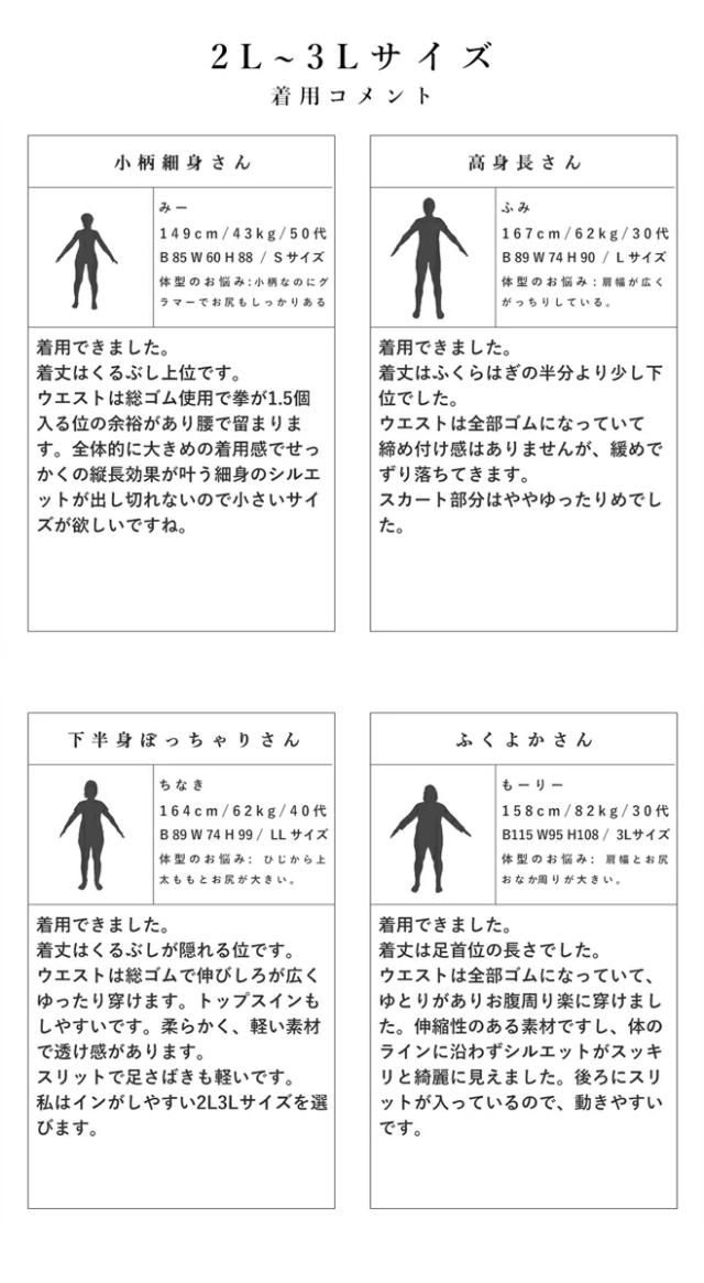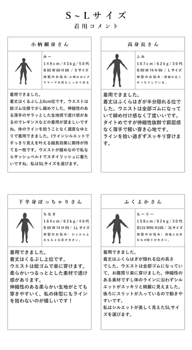 | 【S~L】(モデル着用) ウエスト 64-100 cm 総丈 83 cm 裾幅 55 cm 裏地着丈 55 cm スリット丈 19 cm 【2L~3L】 ウエスト 74-110 cm 総丈 86 cm 裾幅 57 cm 裏地着丈 58 cm スリット丈 19 cm | 素材 (表地) ポリエステル 100% (裏地) ポリエステル 100% ポケット なし メール便 不可 生産国 中国 モデル / 155cm 42kg |