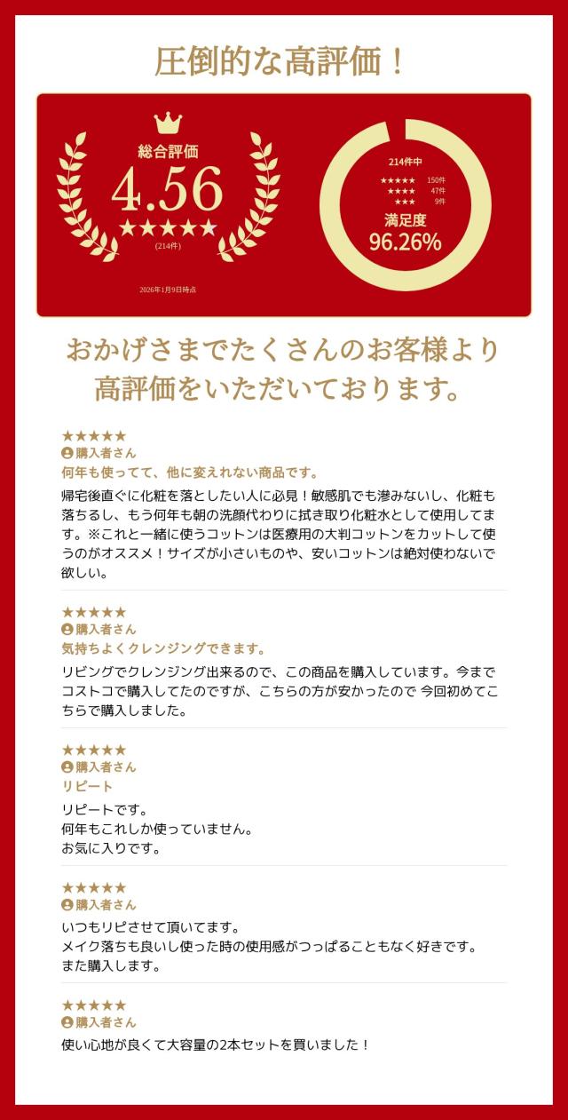 コットンでふき取るだけ。1本でメイク落とし+洗顔+うるおいケア。マスカラなどのアイメイクもきちんと落とし、肌の水分バランスを整え、素肌にうるおいを与えます。