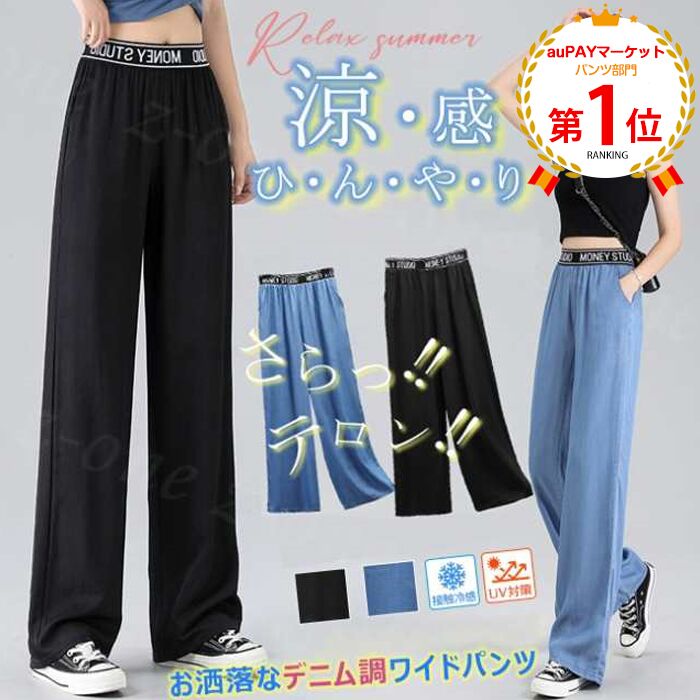 【1点1,050円!2点購入&クーポンで】ワイドパンツ 春新作 送料無料 デニム調パンツ ガウチョ ひんやり 接触冷感 レディース レーヨン生地 薄手 ロング ハイウエスト ゆったり ゴム 夏 秋 大きいサイズ オシャレ ボトムス 体型カバー 着痩せ 入学式 入園式