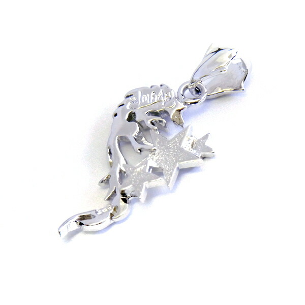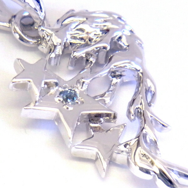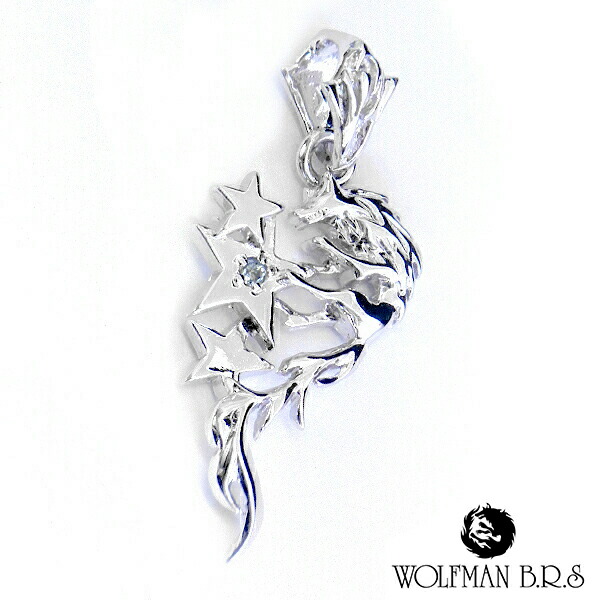 大きさの違う星を立体的に組み合わせ、ホワイトロジウムコーティングを施した狼と合わせたペンダント。