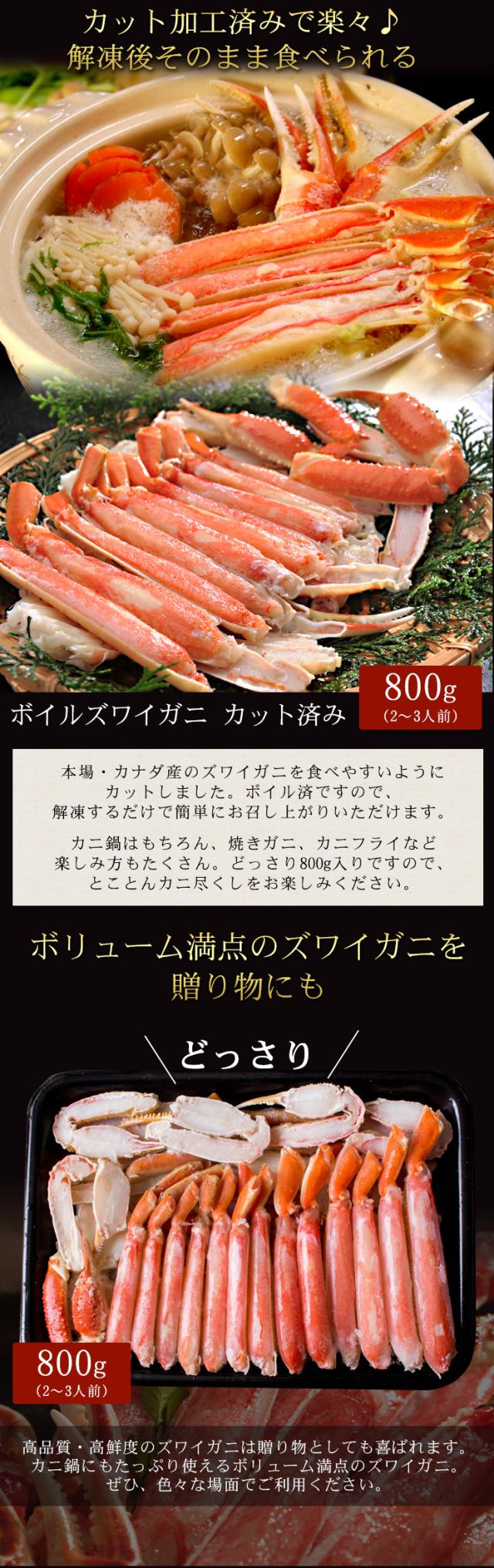 本場・カナダ産のズワイガニを食べやすいようにカットしました。ボイル済ですので、解凍するだけで簡単にお召し上がりいただけます。カニ鍋はもちろん、焼きガニ、カニフライなど楽しみ方もたくさん。どっさり800g入りですので、とことんカニ尽くしをお楽しみください。[お歳暮 お中元 ギフト プレゼント]