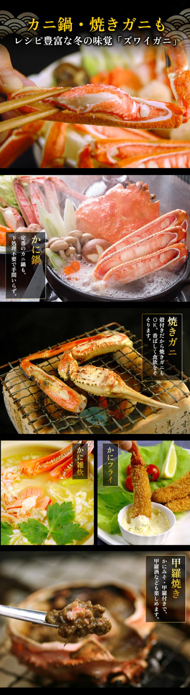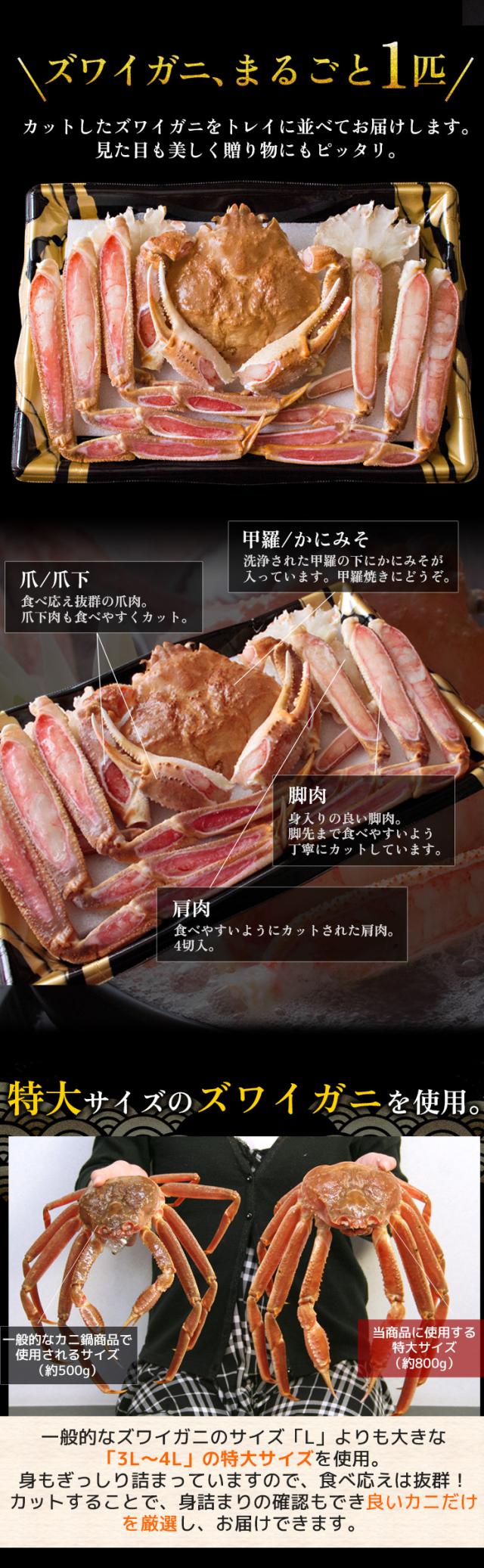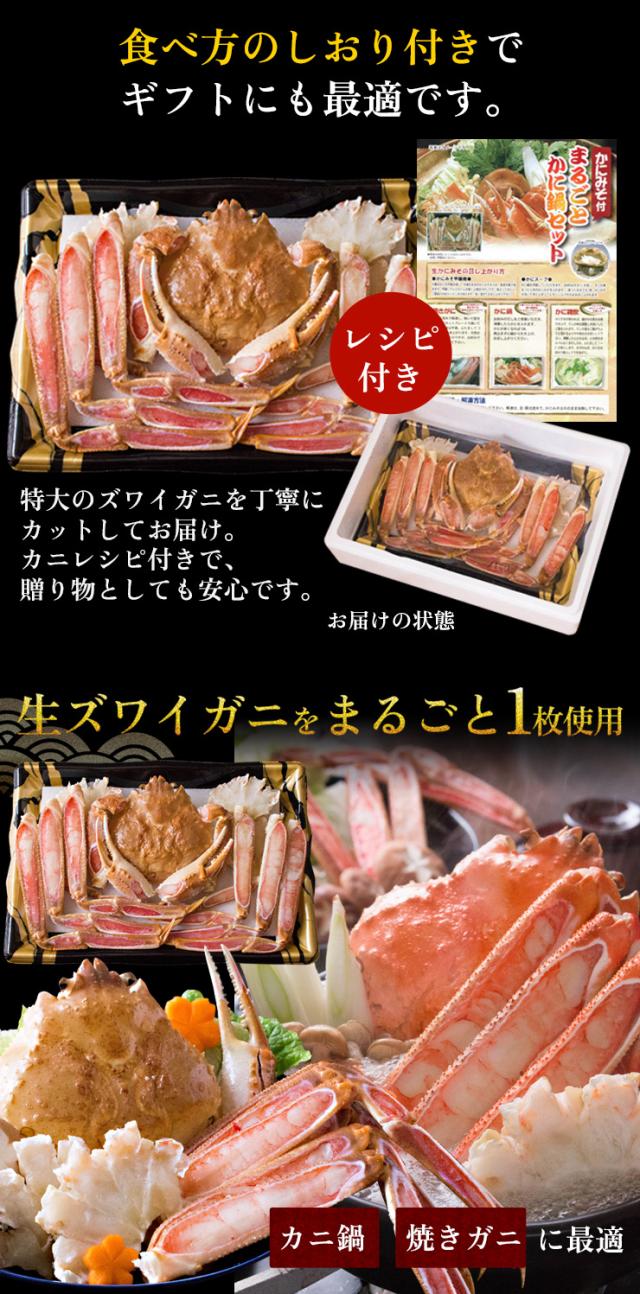 ズワイガニは言わずと知れた「冬の味覚の王様」。サイズが大きく、身入りも良いのが特徴です。中でも身入りの良いズワイガニを、まるごと一匹分食べやすいようにカット。そのまま、カニ鍋にできるセットです。また、生のまま鍋にすることで上質なカニの出汁まで余すところなく堪能でき、〆の雑炊も料亭のような味わいに。さらに、かにみそ付きで甲羅焼きもお楽しみいただけます。[お歳暮 お中元 ギフト プレゼント]