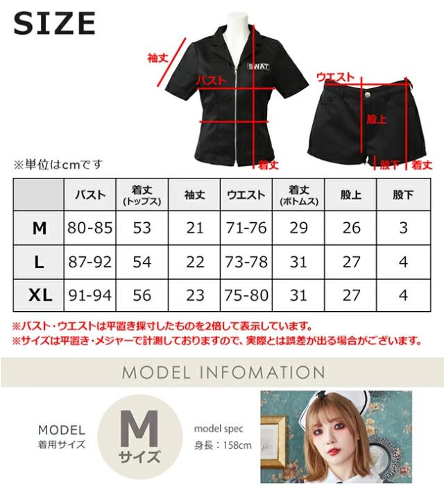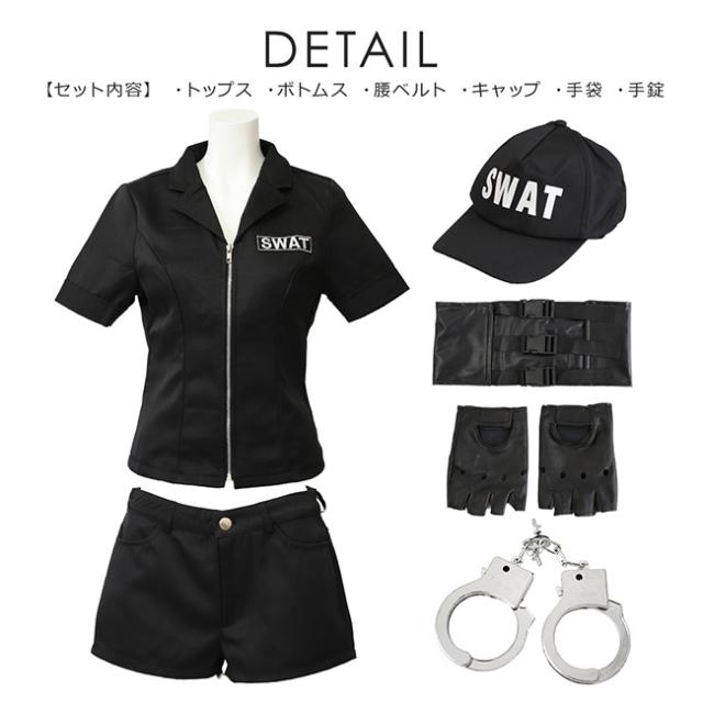 アメリカンスタイルのコスチューム、テーマパークやハロウィンパーティー等で定番になりつつあるSWAT衣装の登場!オールブラックコーデが大人っぽくてカッコイイ雰囲気に。手錠など、遊べて楽しく、なりきり度がアップするプレイバリューたっぷりな小物付き。SWAT衣装の定番のベルト付きデザイントップスと、ショートパンツの組み合わせでスタイルアップ。テーマパークやハロウィン、コスプレ、仮装パーティにはもちろん、結婚式の余興やイベントなどにも使えます!