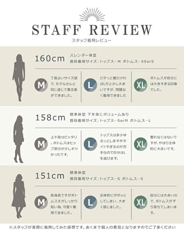 | サイズ | 【Mサイズ】 バスト:80-85 着丈(トップス):53 袖丈:21 ウエスト:71-76 着丈(ボトムス):29 股上:26 股下:3 【Lサイズ】 バスト:87-92 着丈(トップス):54 袖丈:22 ウエスト:73-78 着丈(ボトムス):31 股上:27 股下:4 【XLサイズ】 バスト:91-94 着丈(トップス):56 袖丈:23 ウエスト:75-80 着丈(ボトムス):31 股上:27 股下:4 ※バスト・ウエストは平置き採寸したものを2倍して表示しています。 ※サイズはすべてCM(センチ)表記です。 ※サイズは平置き・メジャーで計測しておりますので、実際とは誤差が出る場合がございます。 |