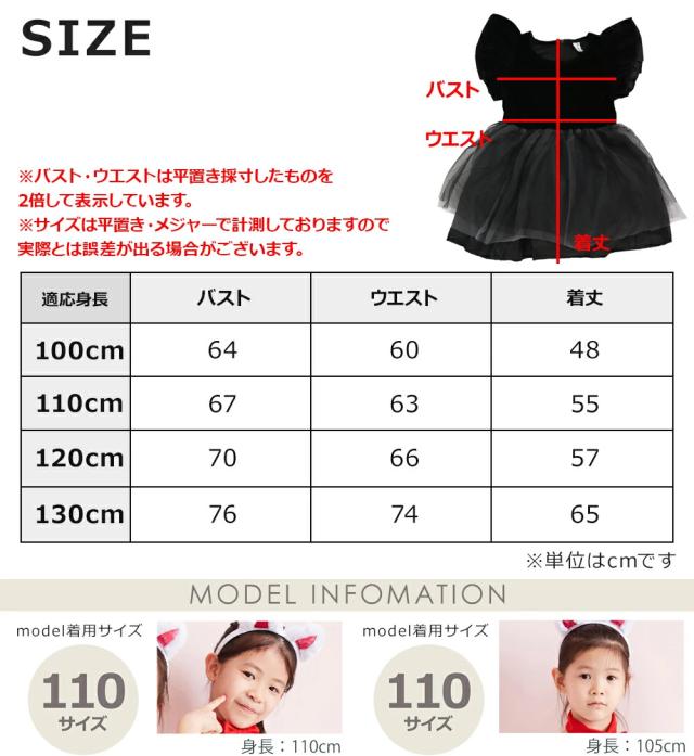 | サイズ | 【適応身長:100cm】 バスト:64 ウエスト:60 着丈:48 【適応身長:110cm】 バスト:67 ウエスト:63 着丈:55 【適応身長:120cm】 バスト:70 ウエスト:66 着丈:57 【適応身長:130cm】 バスト:76 ウエスト:74 着丈:65 ※バスト・ウエストは平置き採寸したものを2倍して表示しています。 ※サイズはすべてCM(センチ)表記です。 ※サイズは平置き・メジャーで計測しておりますので、実際とは誤差が出る場合がございます。 |