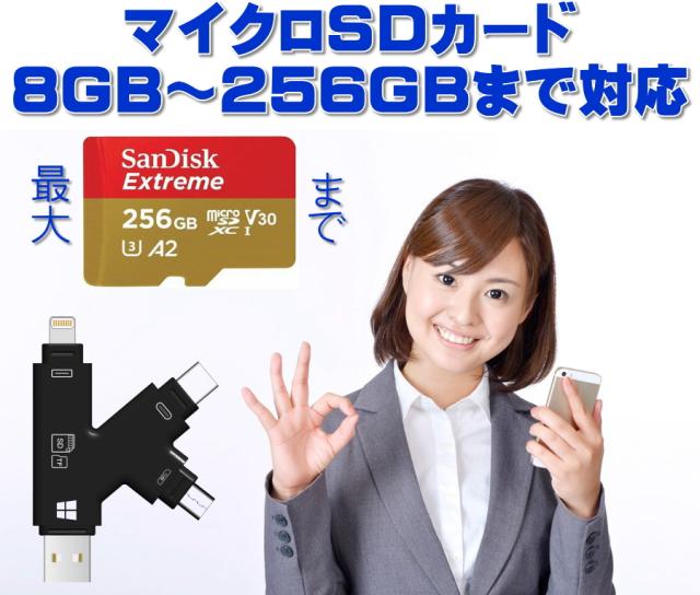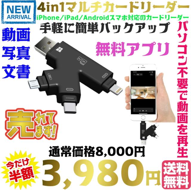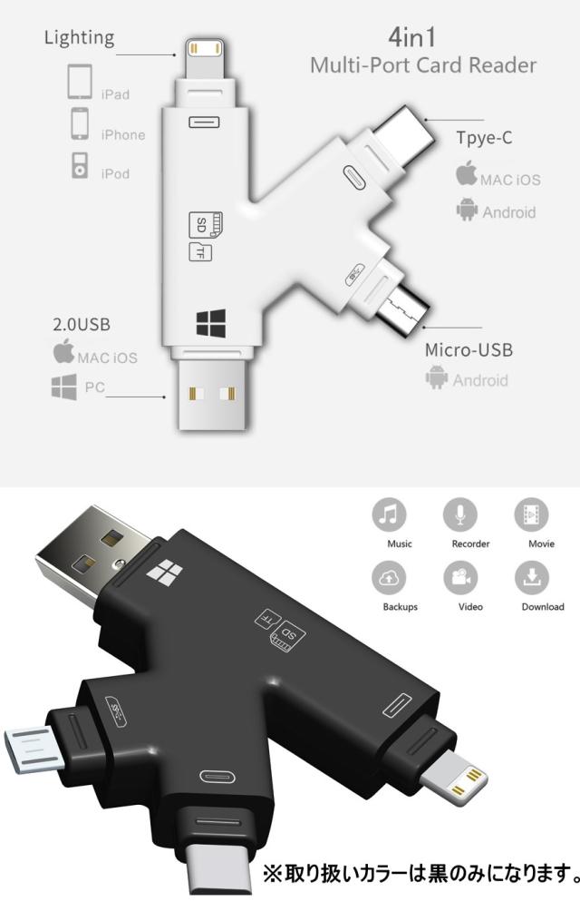 【送料無料・税込み】最新 4in1 マルチカードリーダー TB-MLC パソコン 不要 スマホ で 再生 できる 見ること 閲覧 バックアップ 保存 マイクロSDカード USB A C タイプ ライトニング lightning i-phone android 相互 読み込み 書き込み i Flash Device カメラ 撮った avi