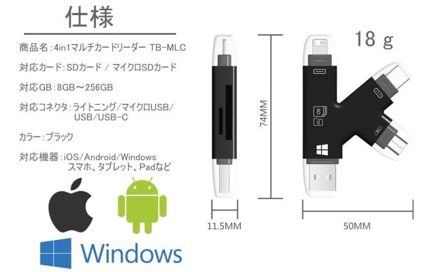 最新 4in1 iPhone/iPad/Androidスマホ対応のカードリーダー TB-MLC