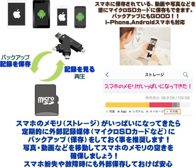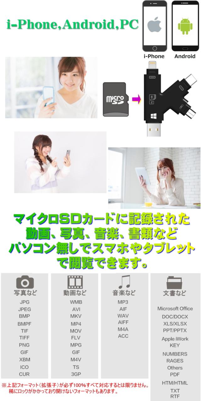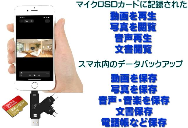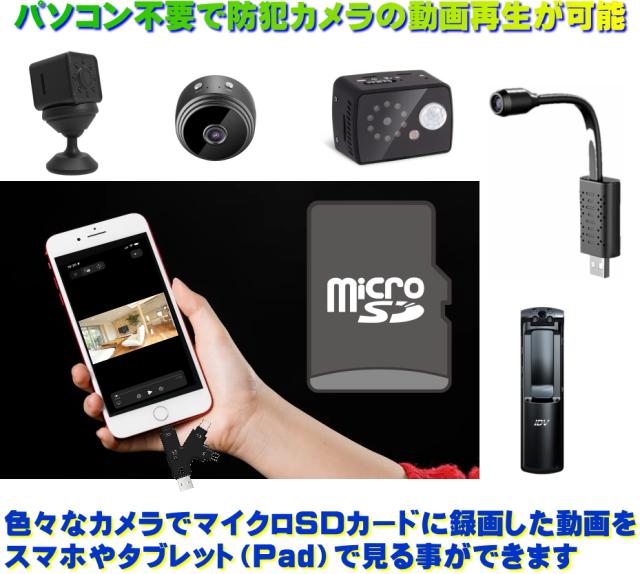 カードリーダー USB マイクロ SD カード スマホ スマートフォン i-Phone iphone i-pad ipad アイホン アイフォン android アンドロイド 動画 画像 写真 記録 防犯カメラ camera セキュリティ ネットワーク IP カメラ 防犯 小型