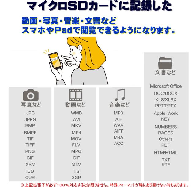 マイクロSDカードをこのカードリーダーに挿してスマホやタブレット(Padなど)に挿せば、マイクロSDカードに記録された動画や写真、文書などをスマホで閲覧できるようになります!