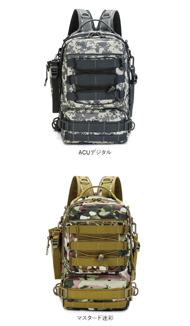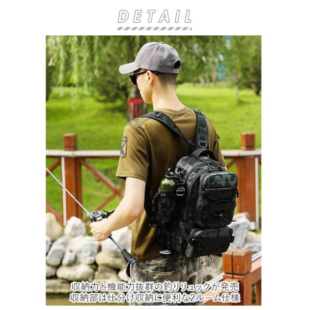 | 商品説明 | ・収納力と機能力抜群の釣りリュックが発売。 ・収納部は仕分け収納に便利な2ルーム仕様。 ・側面まで大きく開くダブルジップタイプで出し入れしやすい。 ・メインルームはA4ファイルが入るサイズ感でオープンポケット×1を装備。 ・セカンドルームはB5サイズのノートがすっぽり入るサイズ感。 ・フロントにはMOLLEシステムに対応したウェビングが縫い付けられたマチのあるファスナー付きポケット×2を装備。 ・上段のファスナーポケット部分に反射蛍光素材を採用したデザイン。 ・左側面にはドローコードで収納口を調節できるポケット×1を装備。 ・右側面にはDカン付きの面ファスナーで開閉できる収納スペースとオープンポケットを各1ずつ装備。 ・背面にはメッシュ仕様になった面ファスナー式のポケット×1を装備。 ・底面には両端に面ファスナーを各1ずつ備えた、折りたたみ傘が入るサイズ感の収納スペースを装備。 ・ショルダーベルトはファスナーを開閉することでリュックタイプとワンショルダータイプとで自由に使い分け可能。 ・両サイドにDカンがついているから、左右どちらにでもショルダーベルトを取り付けられお好きな向きで使用できる。 ・さらに取り外しのできるショルダーベルト付きで、肩掛けとしても持ち歩ける。 ・リュック生地には軽量で撥水加工を施した素材を採用。 ・釣りだけに限らず、アウトドアシーンに最適な多機能リュック♪ |