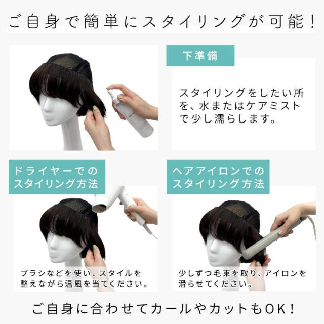 人毛100%なので、ご自身の髪と同じように、ぬるま湯洗いやドライヤー・カラーリング・パーマなどが可能です。