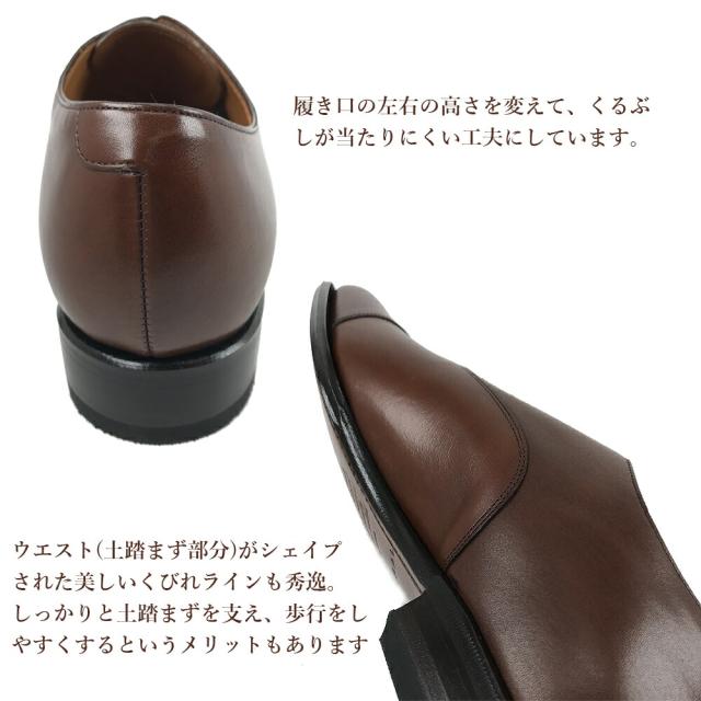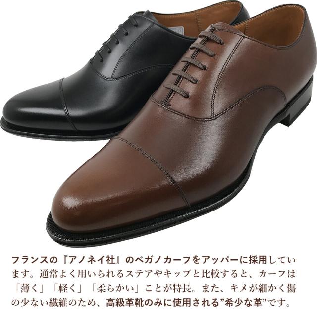 フランスの有名タンナー『アノネイ』社のベガノカーフをアッパーに採用。繊細かつシャープな見栄えにこだわり、底の周りの角を丸く削った「ヤハズコバ」仕上げや、アッパーに施された細かな番手のステッチングが特徴で耐久性にも優れたグッドイヤーウエルト式製法のシューズです。