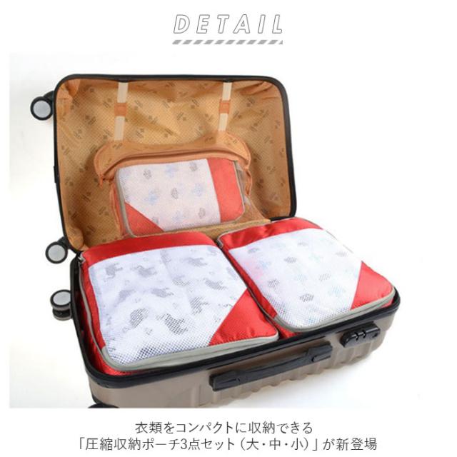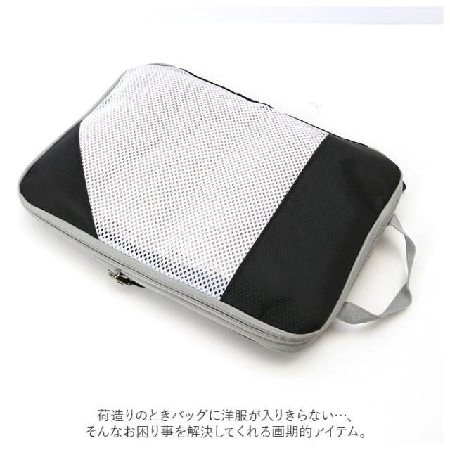 | 商品説明 | ・衣類をコンパクトに収納できる「圧縮収納ポーチ3点セット(S・M・L)」が新登場。 ・ケースはラウンド型のファスナーでガバッと大きく開くことが可能。 ・衣類を収納し全てのファスナーを閉めるだけで、厚みが半分程度にまで圧縮! ・ケースの表面は中身の確認がすぐにできるメッシュデザイン。 ・素材は撥水加工を施したナイロンを採用。軽量で耐久性があり、汚れがつきにくいのが嬉しい。(メッシュ仕様の部分は撥水になりません) ・持ち手付きだからスーツケースから取り出しやすく、着替えの持ち運びにも便利。 ・荷造りのときバッグに洋服が入りきらない…、そんなお困り事を解決してくれる画期的アイテム。 |