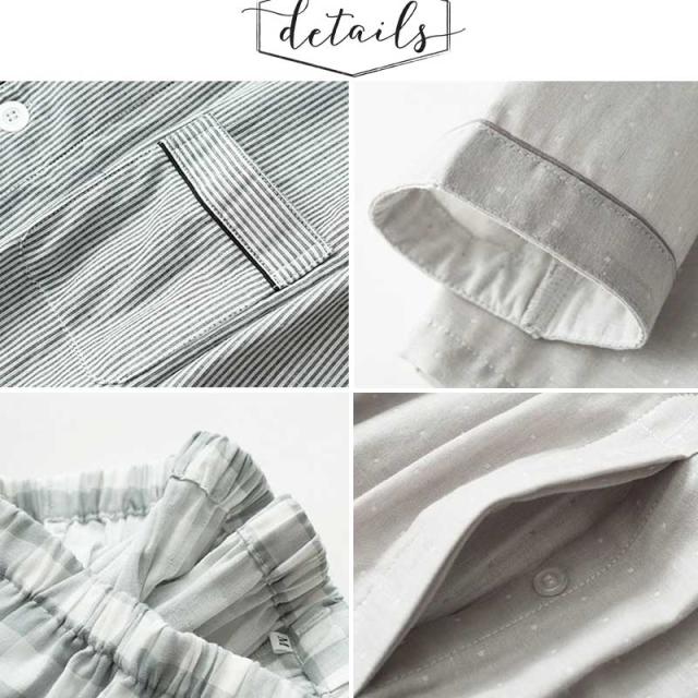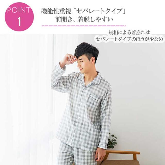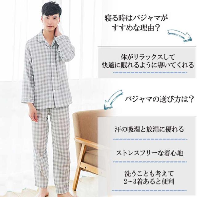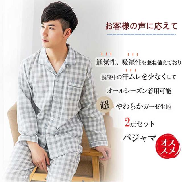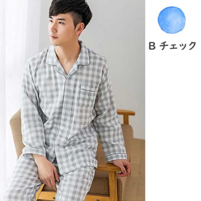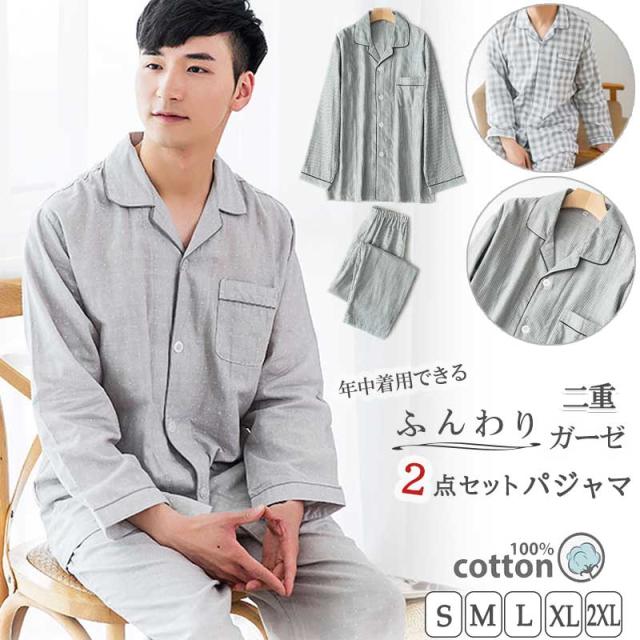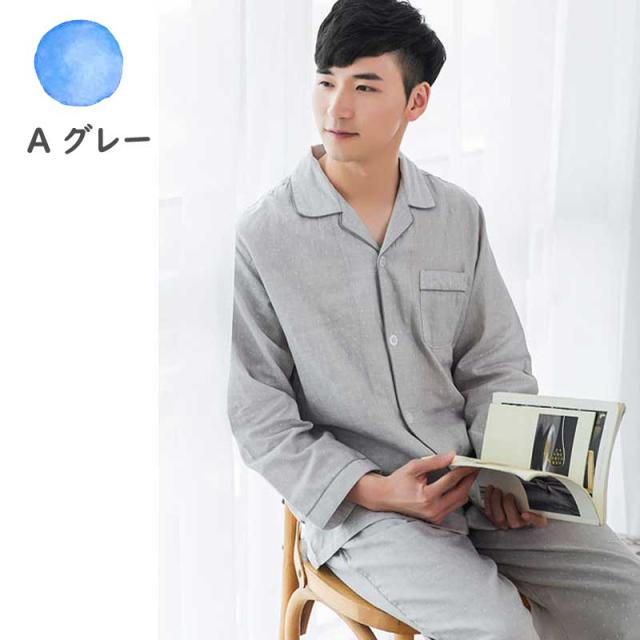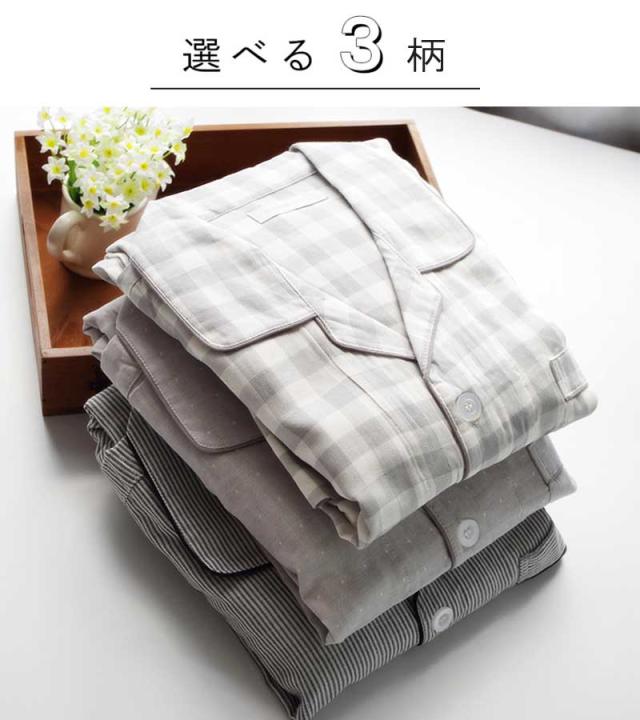 ルームウェア パジャマ メンズ 部屋着 ダブルガーゼ 綿100% コットン100% シンプル ナイトウエア 大きいサイズ 上下セット コットン ダブルガーゼ 春 夏 秋 男性 紳士 シンプル 父の日 敬老の日 ギフト 前開き チェック グレー ストライプ 敏感肌 長袖 高級 長ズボン 長袖