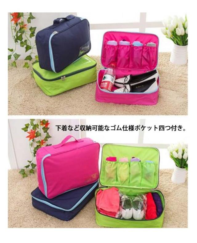 | 服も入る大きめサイズなので旅行やスパ、ジムなど様々な場面に合う収納ケース。 ポリエステル撥水生地を使用。 使用便利なハンドルが付き、手提げやフックにかけたりすることが可能。 下着など収納可能なゴム仕様ポケット四つ付き。 トラベルポーチとして はもちろん、家族の衣類や靴などの収納ケースとしてもご利用いただける。 | |