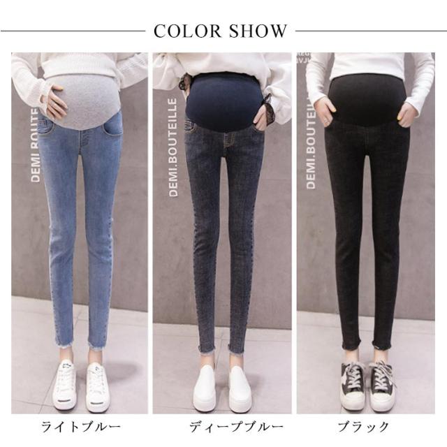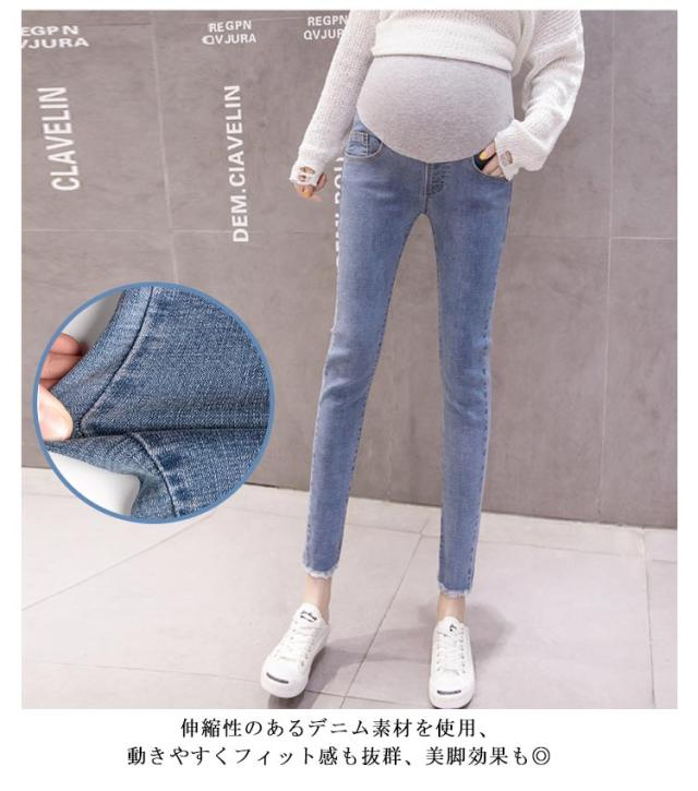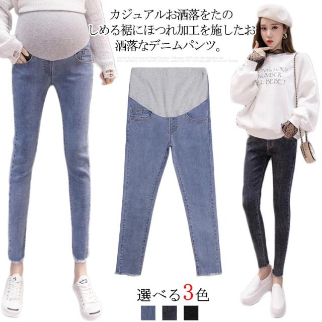 | カジュアルお洒落をたのしめる裾にほつれ加工を施したお洒落なデニムパンツ。 毎日のコーデとも合わせやすく1枚持っているととっても便利なアイテムです。 伸縮性のあるデニム素材を使用、動きやすくフィット感も抜群、美脚効果も◎ ウエストにはアジャスト機能付き、妊娠初期から産後まで履けるデザインです。 お腹周りもお腹の大きさに合わせて、伸縮できるような素材を使用、お腹周りにフィットしお腹を優しくサポートします。 | |