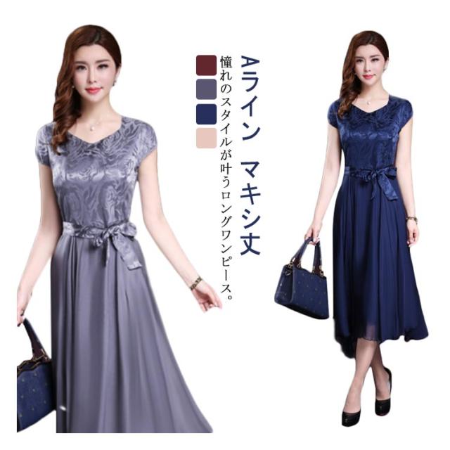 ベルト付フレンチスリーブワンピース レディース ワンピース ドレス マキシ丈 ロング丈 フレア Aライン フレンチスリーブ Vネック パーティー 結婚式