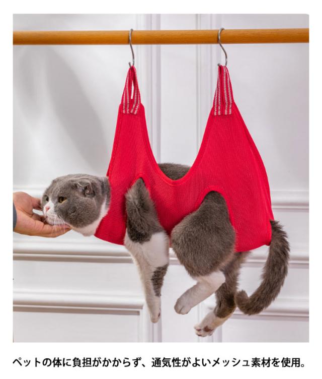 | シャンプー、爪切り、耳掃除、耳毛抜き、歯磨きなどが苦手な犬・猫に! ハンモックで身体を包み込み安定させ、身体全体をしっかり支えてあげることで、抱っこされているような安心感に、わんちゃんも暴れず安全に自宅ケアをすることができます。 ペットの体に負担がかからず、通気性がよいメッシュ素材を使用。 使い方簡単!付属のS字フックをハンモックの穴に通して吊るすだけ! 洗濯機洗いも可能なので、いつでも清潔に保つことができます。 | |
