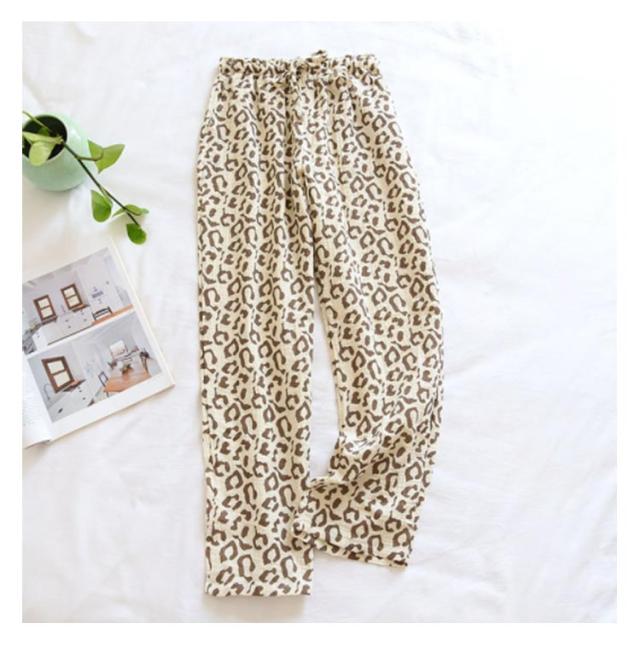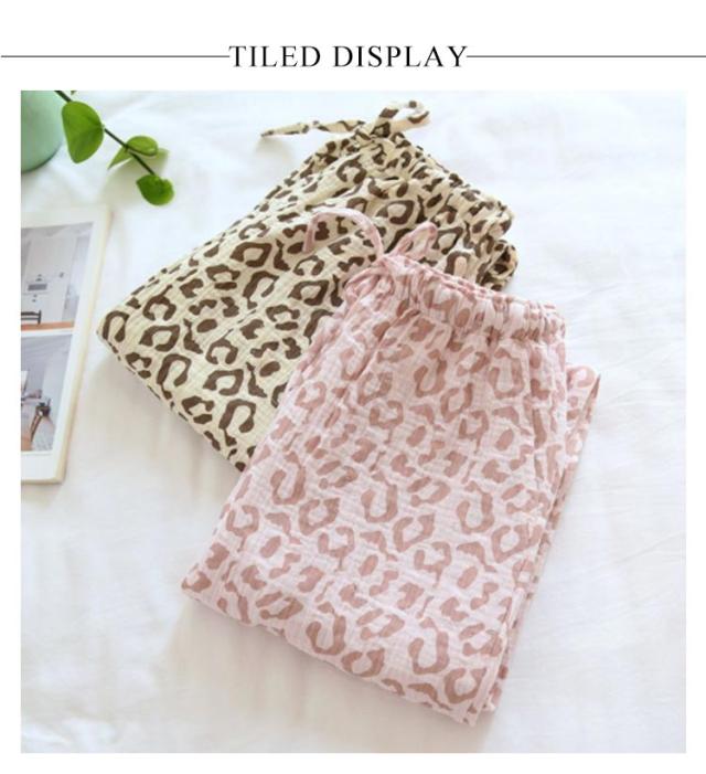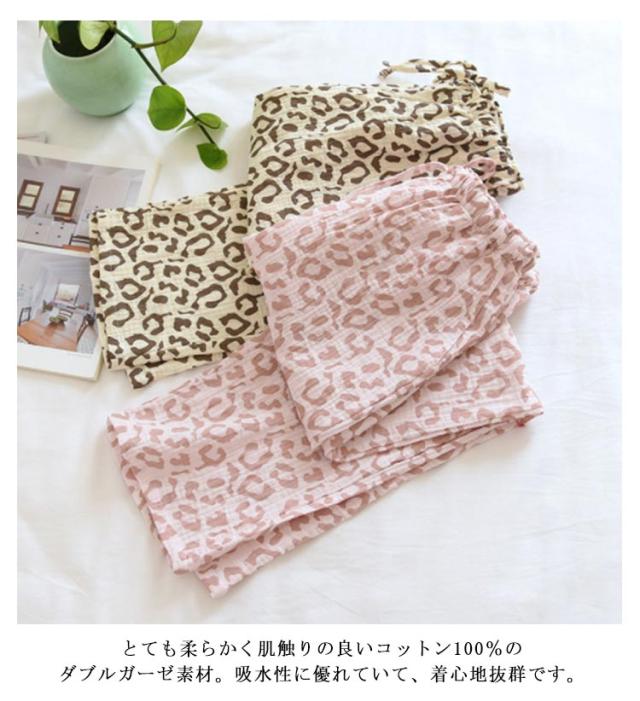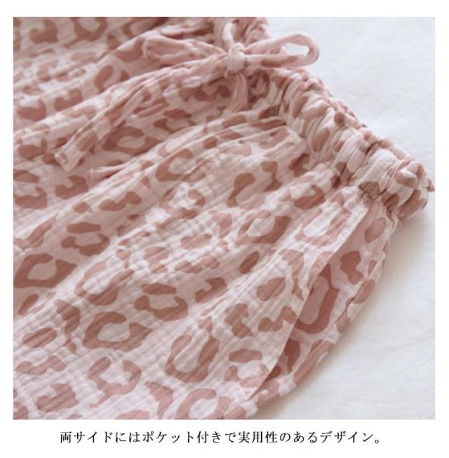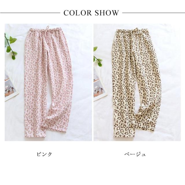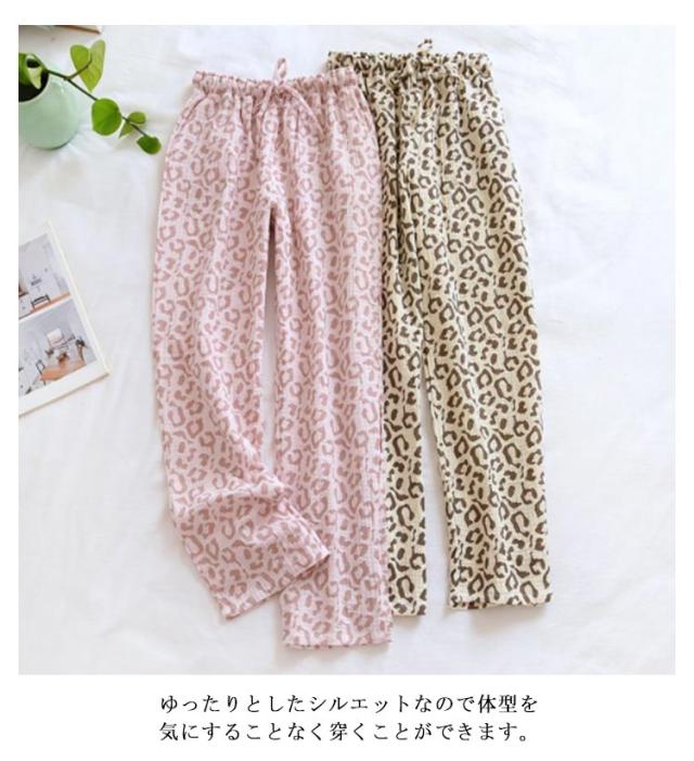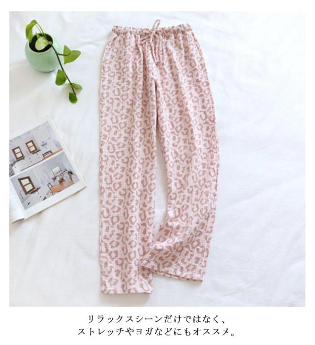 送料無料 ロングパンツ ダブルガーゼ パンツ ルームウェア レディース 綿100% ワイドパンツ ルームパンツ ヒョウ柄 ルームウェア パジャマ パンツ 長ズボン 春 夏 秋 部屋着 寝間着 ウエストゴム ゆったり 大きいサイズ やわらかい 冷え性対策 エアコン プレゼント