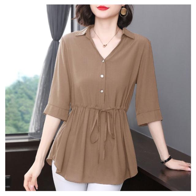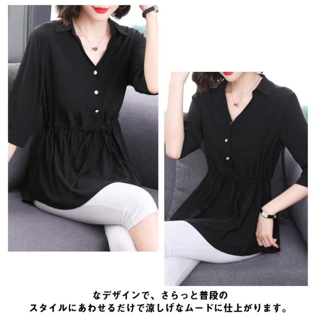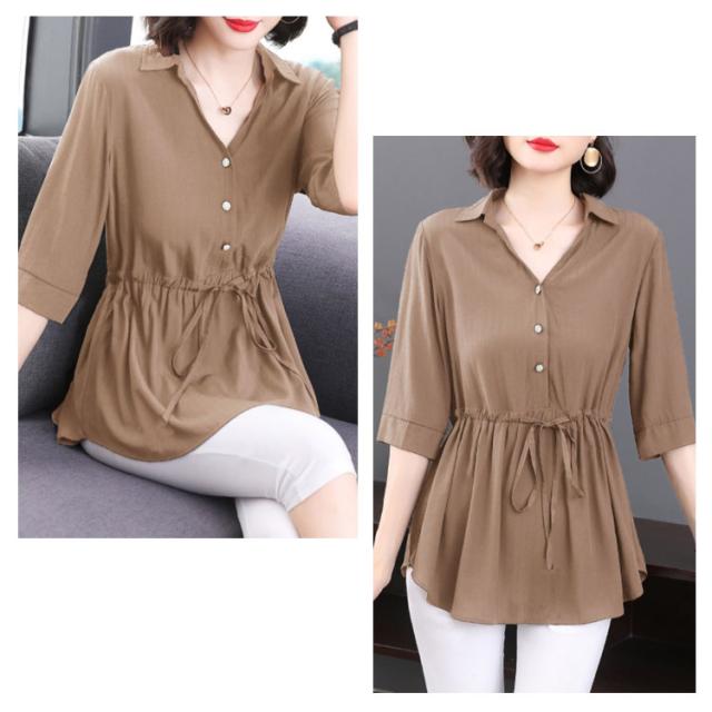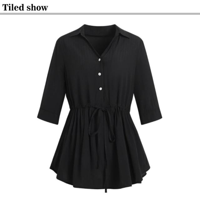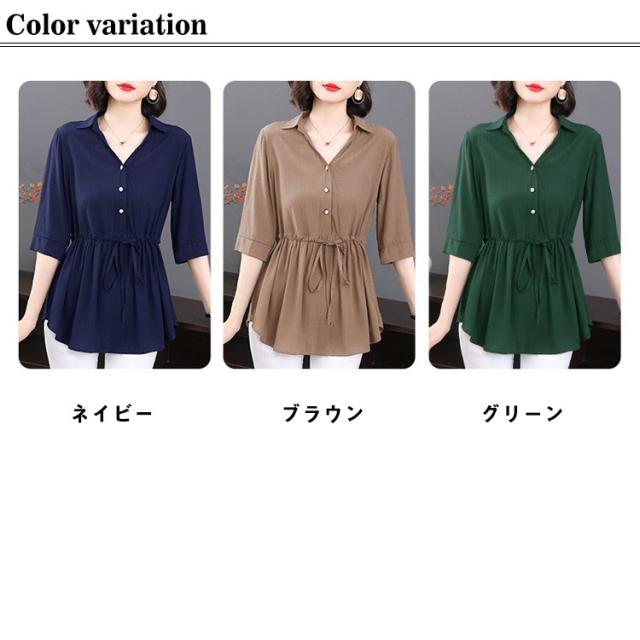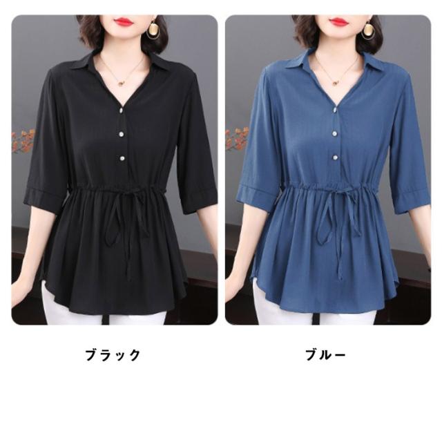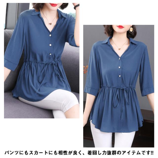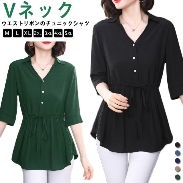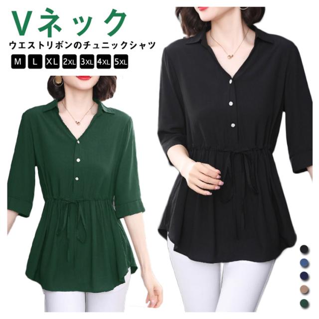 チュニックシャツ 五分袖 七分袖 ウエストマーク ウエストリボン 夏 春服 夏服 秋服 Vネック ゆったり チュニックシャツ 夏 トップス カジュアル シンプル 大きいサイズ M L XL 2XL 3XL 4XL 5XL