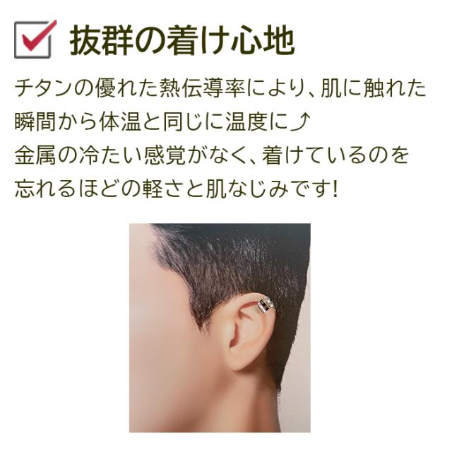 耳に触れる部分がピアスより大きいからこそ、金属アレルギー対応で快適な着け心地の純チタンの良さを、存分に感じていただけるはず。