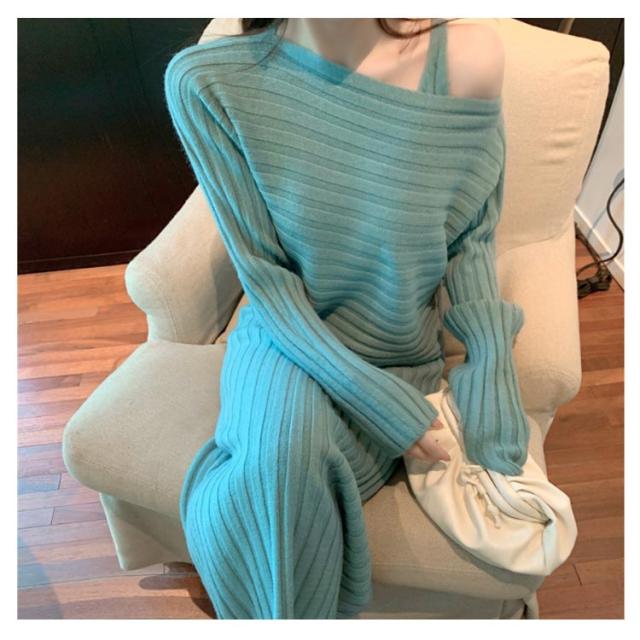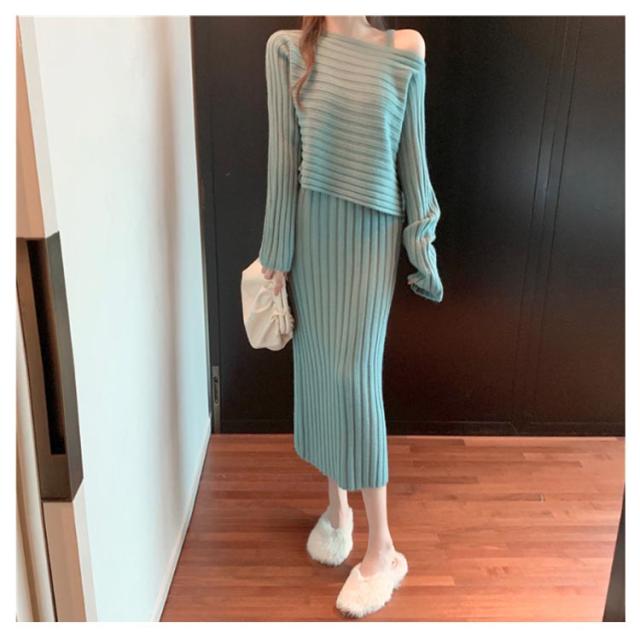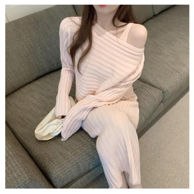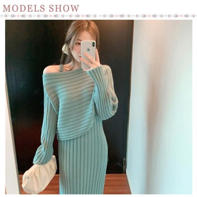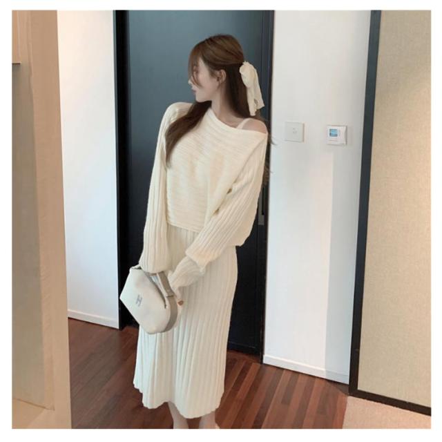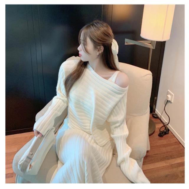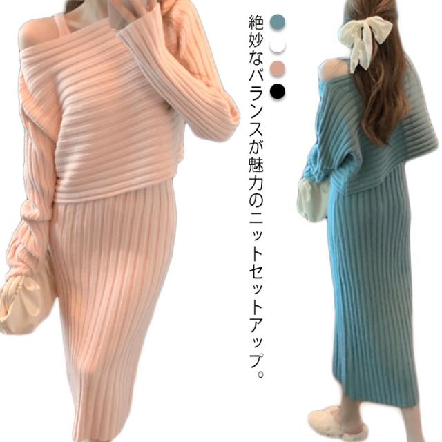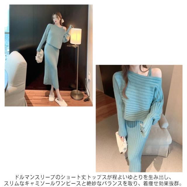 ニット セットアップ ニットワンピース レディース 長袖 ニットトップス+キャミソールワンピース リブニット フェミニン 2点セット おしゃれ 韓国ファッション 秋冬