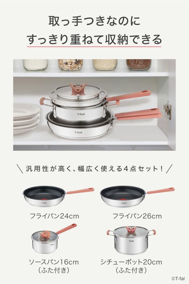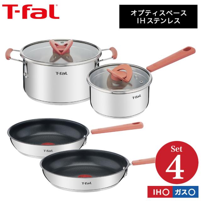 ティファール T-fal 送料無料 フライパン 両手鍋 オプティスペース IHステンレス 4点セット G729S4 IH・ガス火対応 24cm 26cm 鍋 ソースパン シチューパン t-fal T-FAL tfal Tfal 誕生日プレゼント