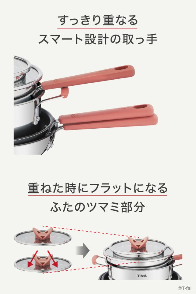 取っ手が薄く、重ねて収納できます。ガラスぶたのつまみは折りたためるバタフライタイプで、すっきり重ねられます。限られたスペースにコンパクトに収納したい方におすすめです。