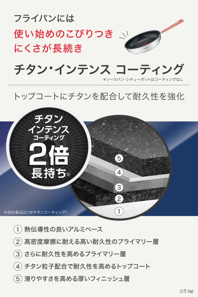 フライパンは「チタン・インテンス コーティング」を施し、使い始めのこびりつきにくさが長く続きます。