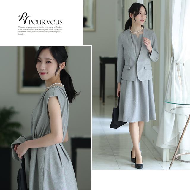 タックの入ったワンピースとノーカラージャケットの2点セット