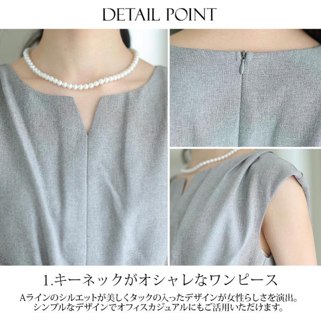 キーネックとトップスにタックの入ったワンピースがオシャレ。