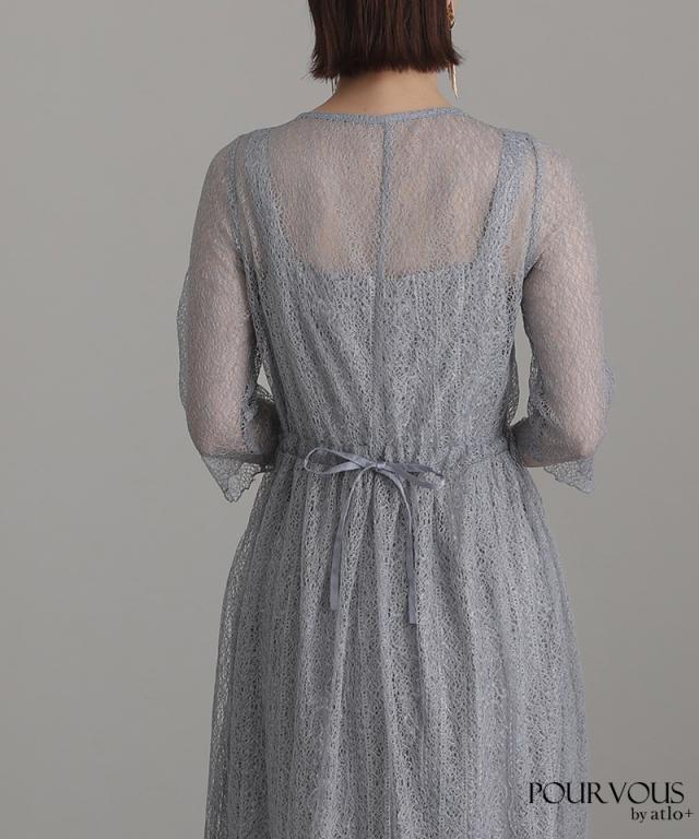 アウターのメロンネットレースがおしゃれで目を惹くワンピースです。