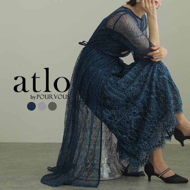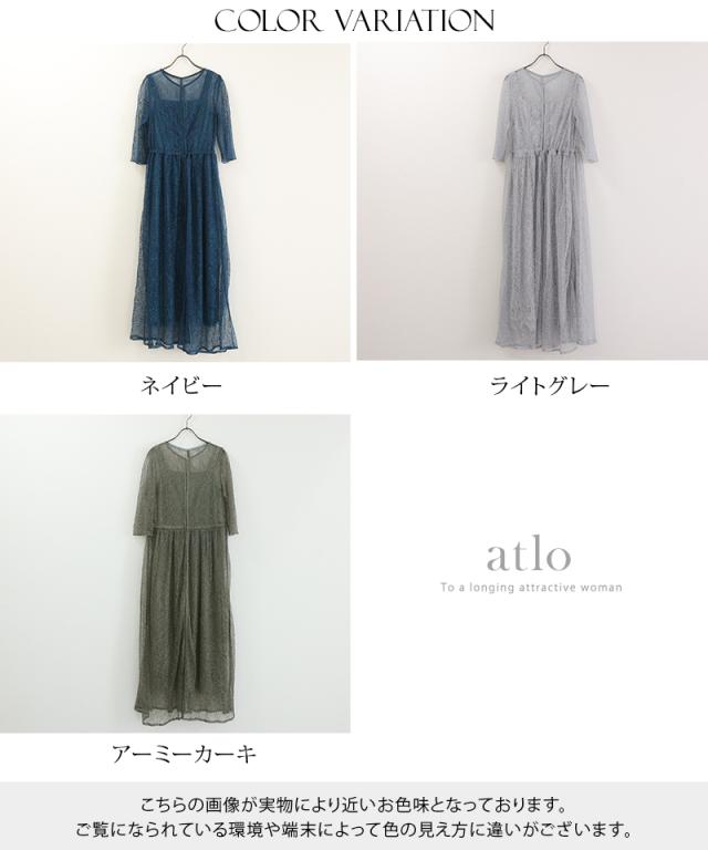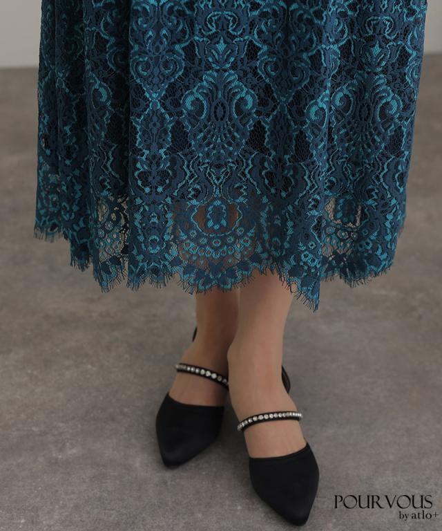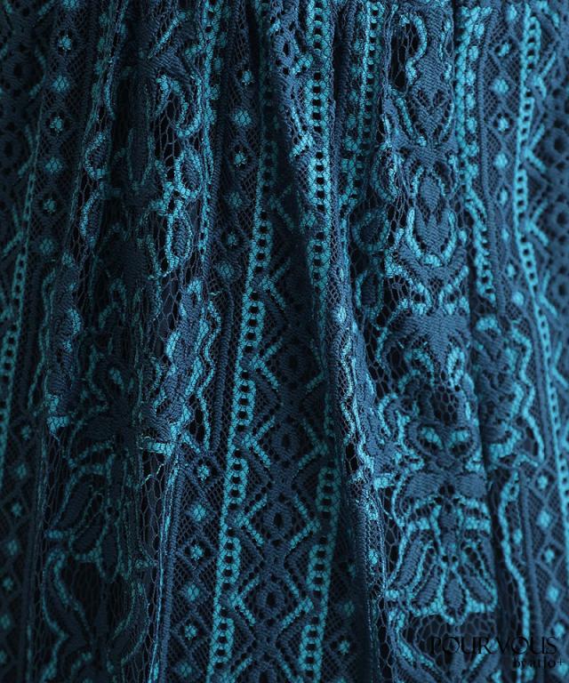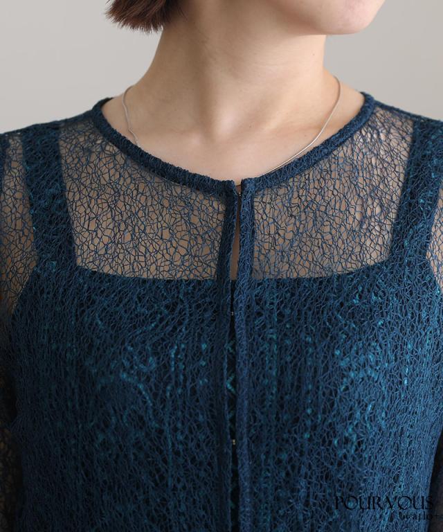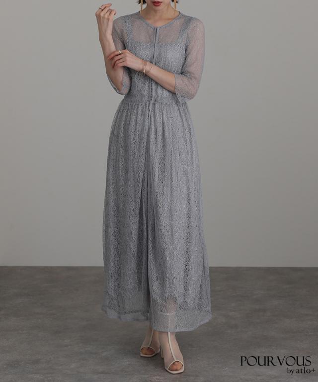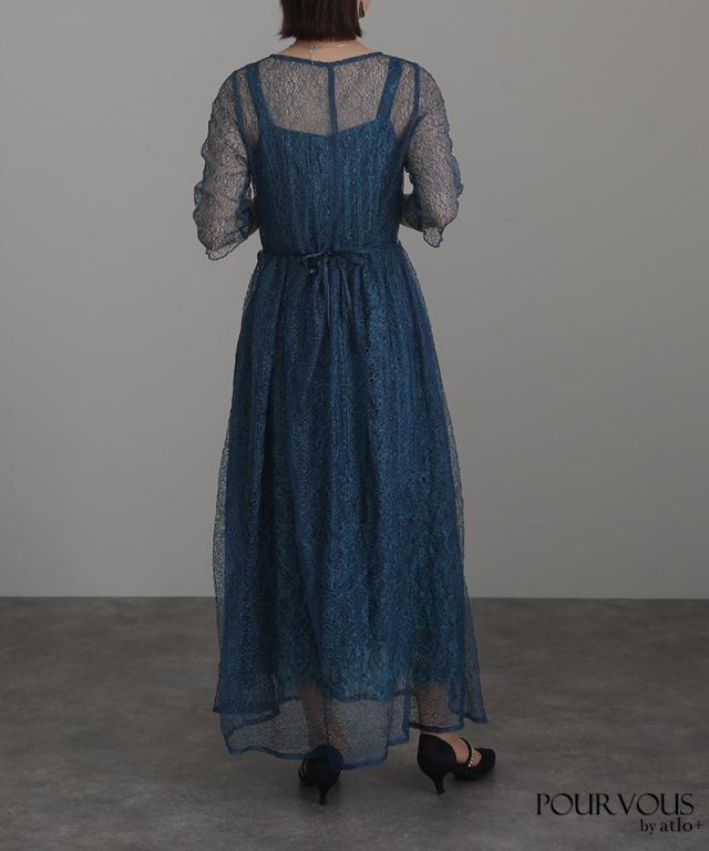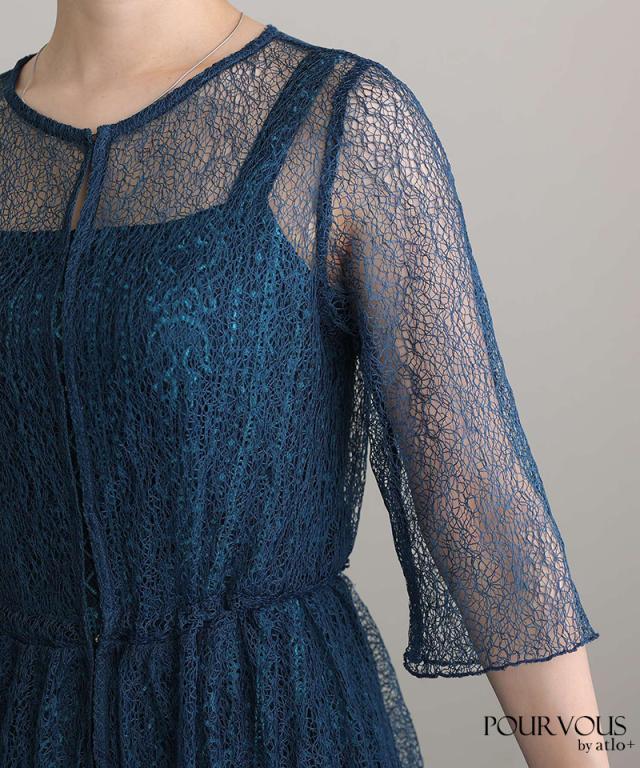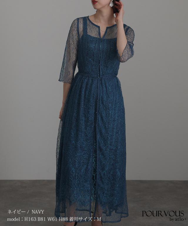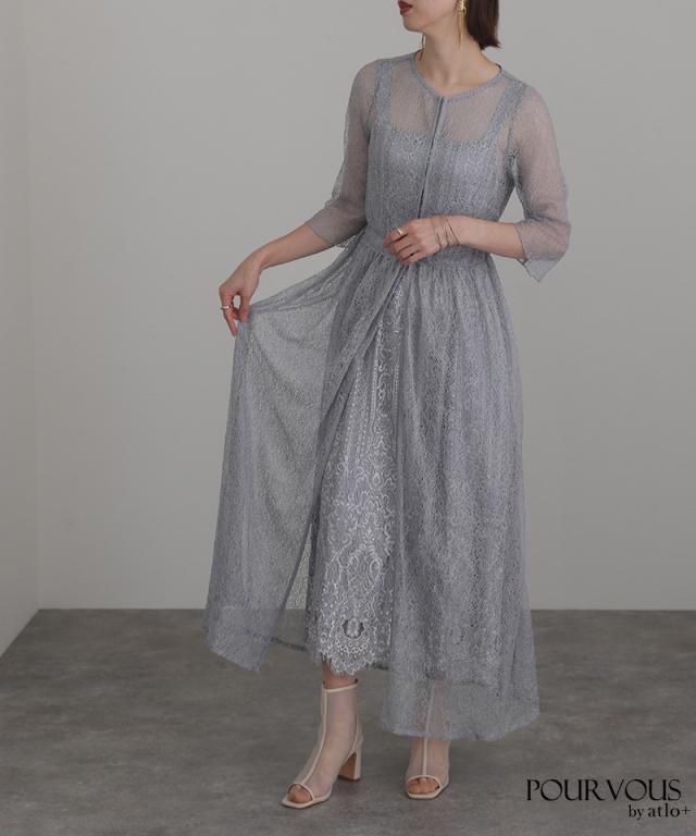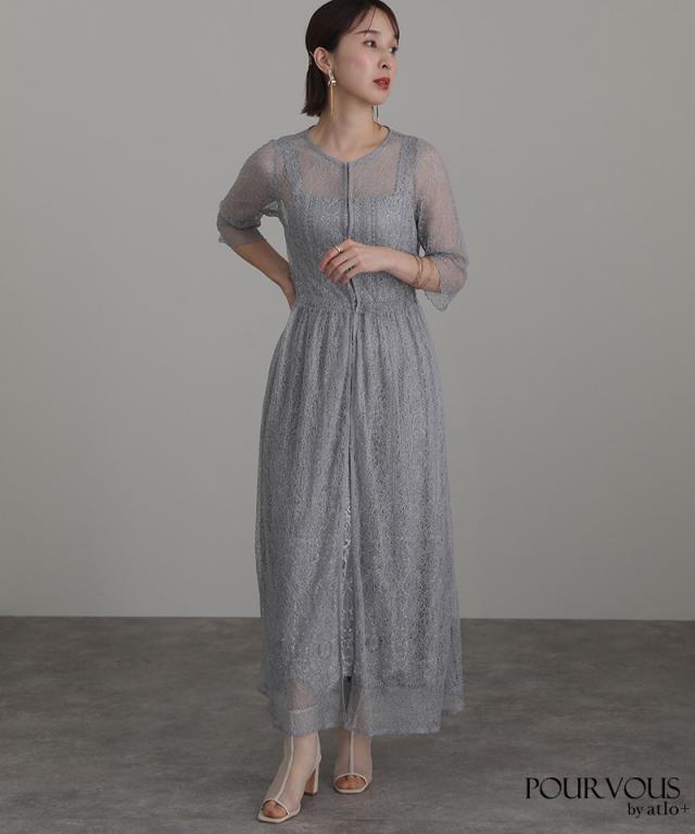 特徴のあるメロンレースが上品でデザイン性のあるドレスです。アウターの生地が軽く、ふわっと広がり抜け感を演出してくれます。