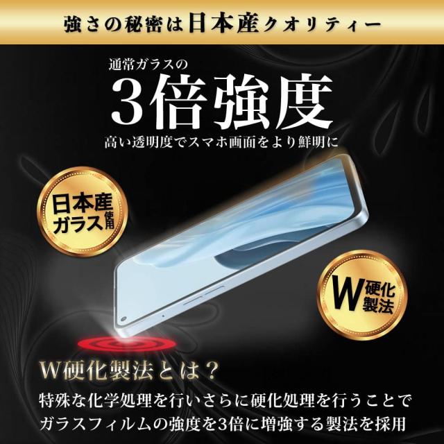 W硬化製法ガラスフィルムは特殊な化学処理を行うことで従来のガラスフィルムに比べ3倍の強度を実現。OPPO Reno7 A OPG04の液晶画面を強固に保護します。